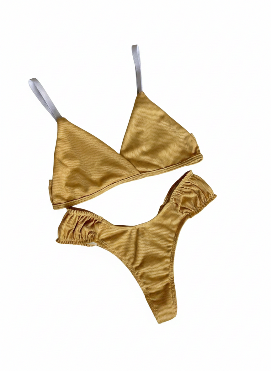 Envuélvete en la calidez y el lujo de nuestro conjunto más luminoso. Este diseño no solo viste tu cuerpo, sino que lo ilumina, capturando la esencia de un atardecer eterno en tu piel. El tono amarillo dorado con acabado satinado crea un efecto de luz único que resalta cualquier tono de piel, aportando una sensación de opulencia y vitalidad.
